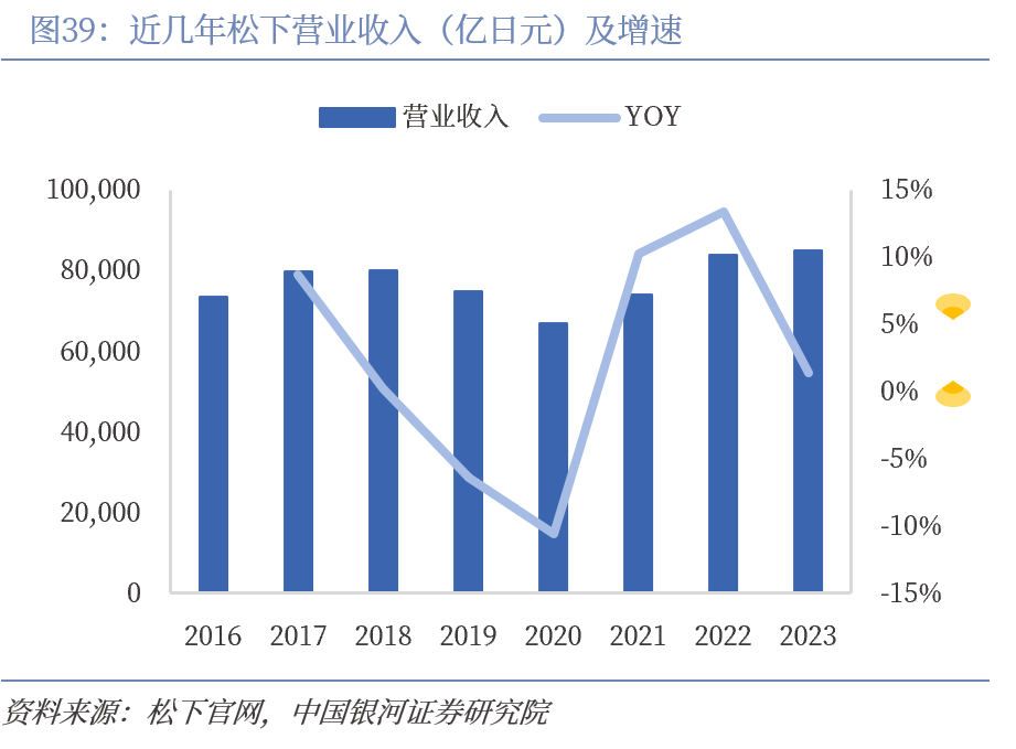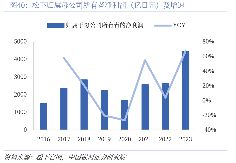 松下成立于1918年,是日本跨国性电子产品生产龙头之一,从事各种电器产品的生产和销售。1952年松下与飞利浦签订技术合作协议,1953年成立中央研究实验室,同年推出公司首款电冰箱,1956年生产首台全自动电饭煲, 1960年研制出公司首台彩色电视。过去松下以黑电组装销售为主,近年来逐步扩大住宅与能源相关及汽车等工业制造,打造综合解决方案供应能力,增加高附加值产品占比和收入多元化水平。2016-2023年间,业务转型阵痛叠加新冠疫情影响,松下营收增长放缓,但归母净利润从2016年的1493.6亿日元快速提升至2023年的4439.94亿日元,主要得益于业务结构优化提升。2023年生活方式业务收入占总营收比例降至41.13%,能源、互联、汽车业务占比提升显著,转型效果逐步显现。
