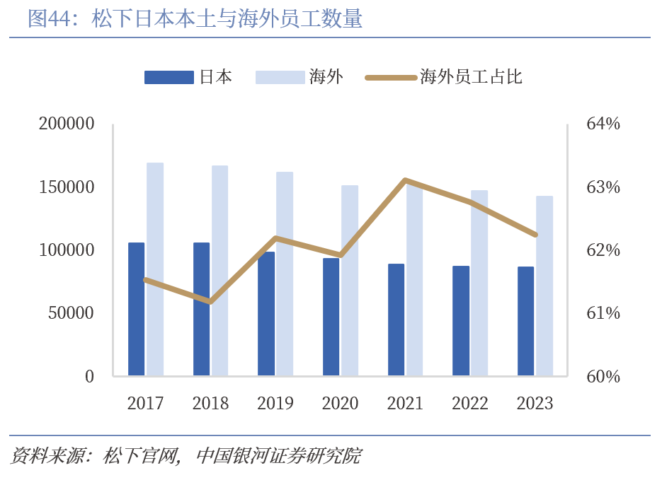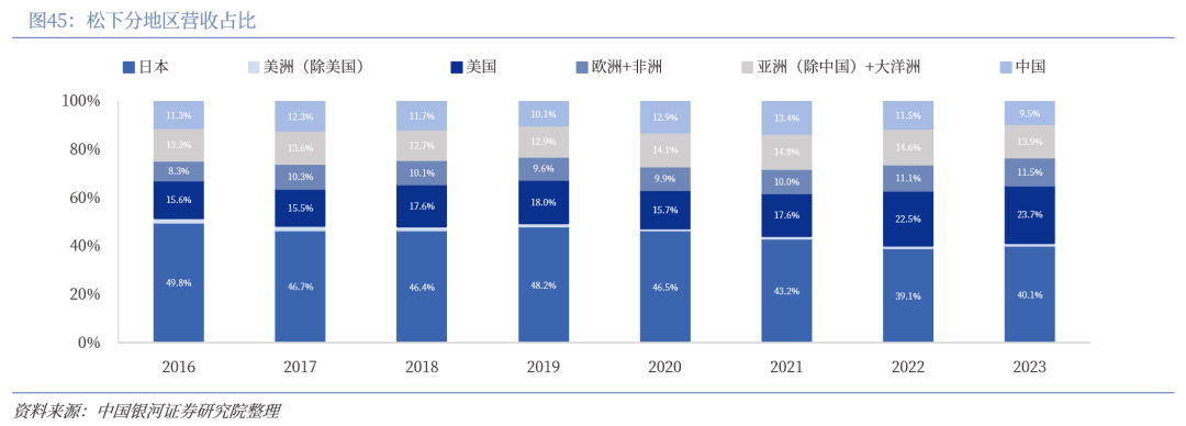 松下海外收入占比持续提升,美国是其最大海外市场。松下海外收入从2016年的36846亿日元增长至2023年的50919亿元,2023年海外收入占比接近60%,同时期海外员工数量实现下降,海外降本增效成果显著。松下主要海外市场包括美国、中国、欧洲,其中美国是其最大的海外市场,近两年营收规模扩张明显,2023年收入占总营收的23.7%,主要系2021年松下并购美国AI软件公司Blue Yinder后收入快速提升。