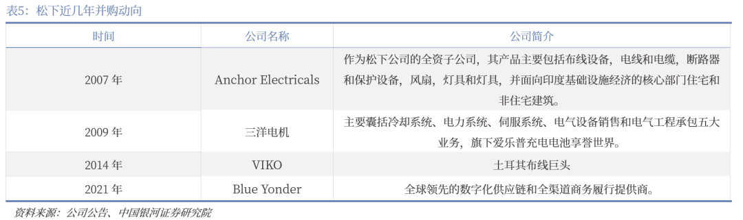 剥离亏损业务,并购转型换发新生。松下曾在等离子电视领域投入巨额研发费用,建立了很高的技术壁垒,后由于技术进步,液晶技术短板迅速改善,液晶阵逐渐成为平板电视的主流,2014年松下彻底终止等离子电视业务,加快新业务转型。此后,松下通过外延并购路径开拓新市场,于2007年收购印度布线配件巨头Anchor Electricals,2009年进军移动电源领域,收购全球最大的充电电池制造商三洋公司,2014年又收购了土耳其布线巨头VIKO公司90%的股权,2021年松下宣布71亿美元收购美国AI软件公司Blue Yonder,在物联网、边缘技术、机器学习及AI等前沿领域布局,同时加速松下自身的数字化转型。