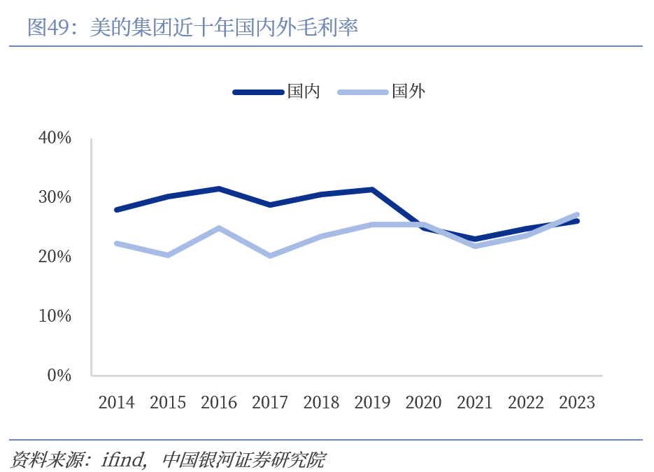 美的海外收入占比约4成,OBM占比提升有望提振盈利能力。美的海外收入从2014年的497.85亿元翻倍增长至2023年的1509.06亿元,其中2017年收购的多家公司并表,海外收入增加显著。但受OEM代工业务拖累,2023年美的外销毛利率为27.16%。2023年OBM业务收入已达海外智能家居业务收入的40%以上,自主品牌竞争力持续提升。未来随着海外自主品牌业务不断扩张,海外盈利能力有较大提升空间。