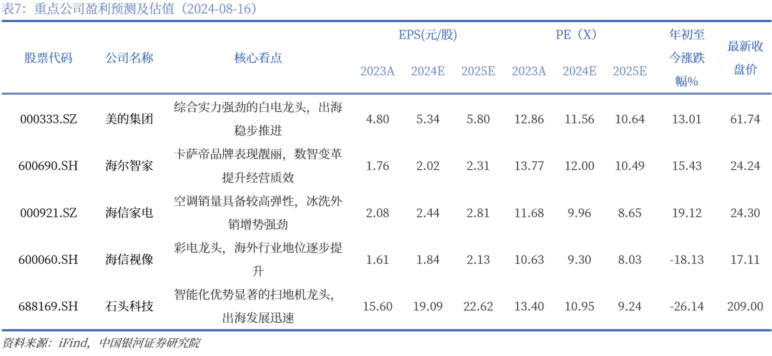 我国家电产业正从成熟走向领先,企业智能制造能力和产品竞争力共振式提升,产业链外溢具备良好基础。未来,我国家电企业将逐步摒弃代工出口、低价竞争等策略,通过发挥技术优势提高产品附加值与创新突破提高品牌附加值这两条重要路径,强化自主品牌的国际竞争力,迈入本土化运营的高水平竞争赛道。家电品牌出海大有可为,建议关注国际化布局领先的海尔智家、美的集团、海信家电、海信视像和石头科技。