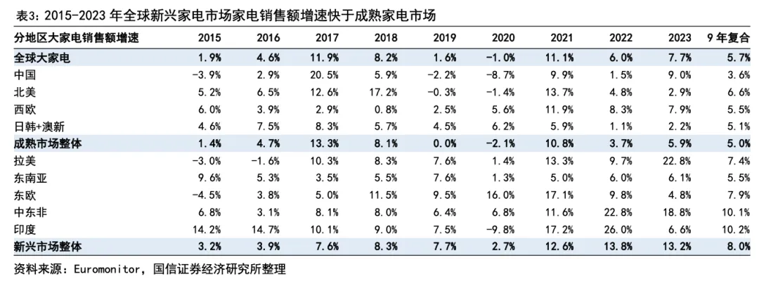 综合来看,成熟市场过去9年整体复合增速在5%,新兴市场9年整体复合增速8%,过去十年全球主要大家电增长动能正由成熟市场向新兴市场转换。