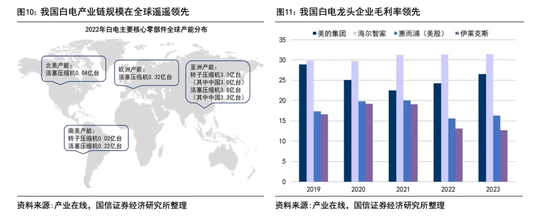 1)规模化支撑下,完善的产业链布局带来的成本优势。得益于我国庞大的劳动力资源和内销需求,改革开放后,国内外家电企业在我国纷纷进行产能建设和布局,随着而来的是大量上游供应链配套的发展和完善。目前我国已拥有全球最大的家电产业链布局,使得我国家电生产具备全球领先的成本优势。从毛利率对比上可以看出明显的差别,国外白电龙头如惠而浦、伊莱克斯等毛利率普遍低于20%,而我国白电龙头海尔、美的等毛利率在25%-30%之间,以自有品牌业务为主的海尔毛利率超过30%。