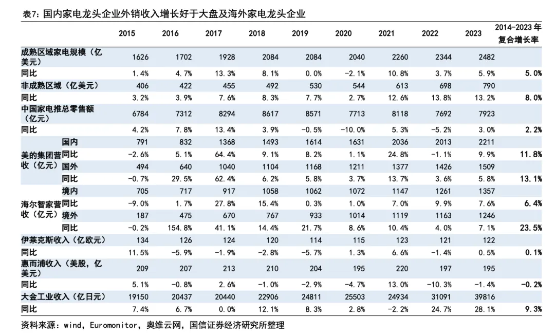 我们可以看到,中国两大全球家电龙头美的集团和海尔智家,2014-2023年国内收入复合增速分别为11.8%和6.4%,快于国内家电行业整体增速;海外复合增速分别为13.1%和23.5%,不仅快于国内增长,也比国外无论是成熟市场、还是新兴市场增长更快。对比海外家电龙头企业来看,2014-2023年惠而浦/伊莱克斯/大金工业的收入复合增速分别为0.1%/-0.2%/9.3%,均低于我国家电龙头在海外的收入增速。(注:惠而浦/伊莱克斯/大金工业的收入口径分别以美元/欧元/日元计算。)
