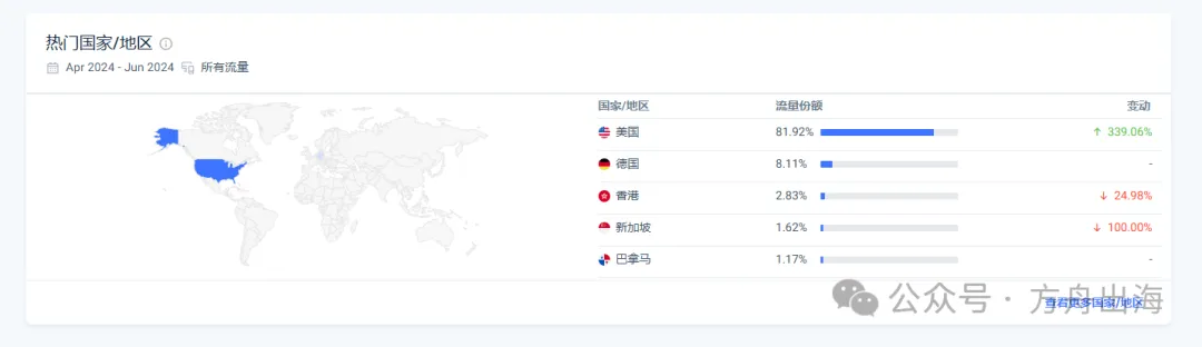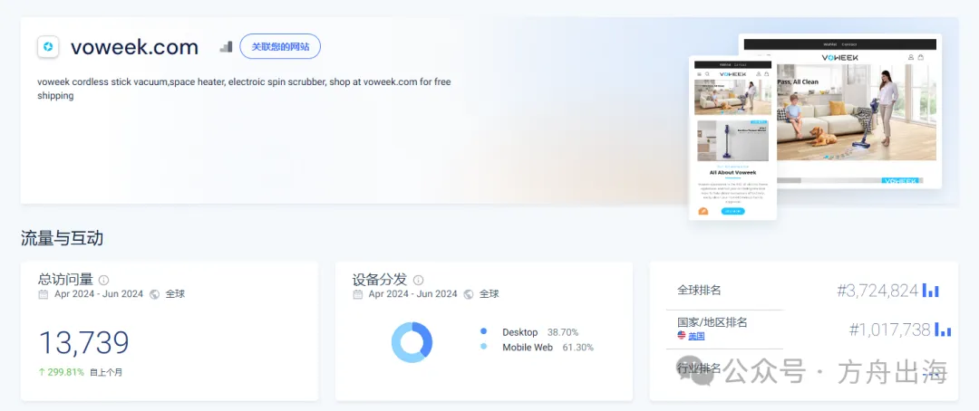 随着Voweek在Tiktok的爆火,其独立站流量也随之上升。根据Similarweb数据可以看出,近三个月该独立站就有13.7W的流量,相比上个月上升了299.81%!其中美国地区占比高达81.92%!