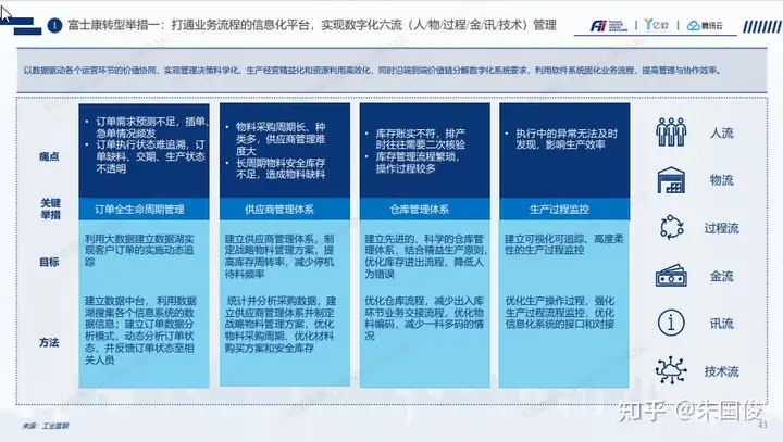 富士康转型举措一:打通业务流程的信息化平台,实现数字化六流(人/物/过程/金/讯/技术)管理。包含订单全生命周期管理,供应商管理,仓库管理,生产过程监控四大管理体系。以数据驱动各个运营环节的价值协同,实现管理决策科学化、生产经营精益化和资源利用高效化,同时沿端到端价值链分解数字化系统要求,利用软件系统固化业务流程,提高管理与协作效率。
