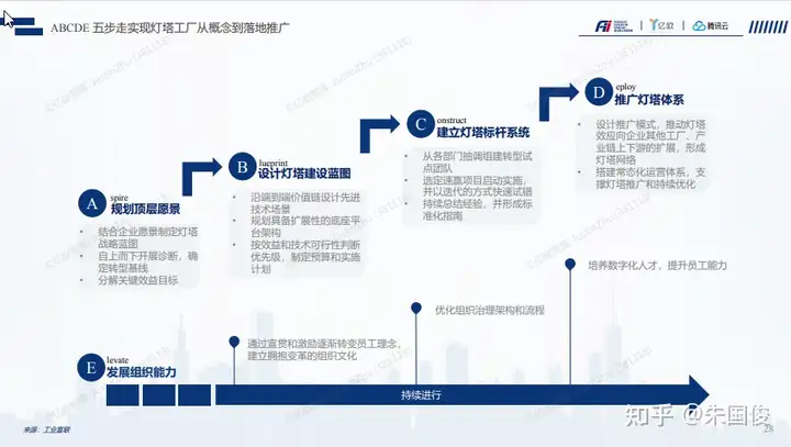 ABCDE 五步走实现灯塔工厂从概念到落地推广。灯塔工厂实施是一个重大的变革,需要在组织内宣贯变革的紧迫性(Creat),需要有强有力管理层的支持,需要有组织的保障(Build),需要有顶层设计,为团队设定明确的目标(Form), 需要向团队宣贯组织实施背景和目标,需要给到团队赋能,通过内部和外部的专家资源提升团队的认识和能力(Enlist), 需要快速的应用和产生小的结果,以便提升团队信心(Generate),需要团队总结最佳实践,并且快速的推广应用(Sustain), 最终将变革的结果和流程固话(Institute)。