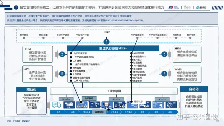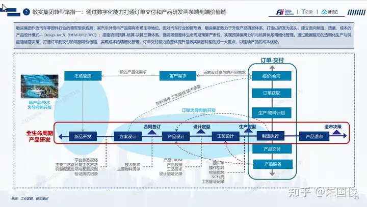 敏实集团转型举措一:通过数字化能力打通订单交付和产品研发两条端到端价值链。敏实集团作为汽车零部件行业的领军型供应商,其汽车外饰件产品具有市场主导地位。面对汽车行业的新形势,敏实集团致力于升级产品研发体系,打造以研发为龙头,建立面向制造、质量、成本的 产品设计模式— Design for X(DFM\DFQ\DFC);搭建项目预算-核算-决算三算体系,强调项目整体生命周期预算严肃性,实现预算偏离分析与核算体系精细化管理。通过数据驱动的透明化生产与供 应链运营决策,打通订单到交付的端到端价值链,实现成本的精细化管理。订单交付能力的整体提升是敏实集团转型的另一大重点,以延续产品的成本优势。