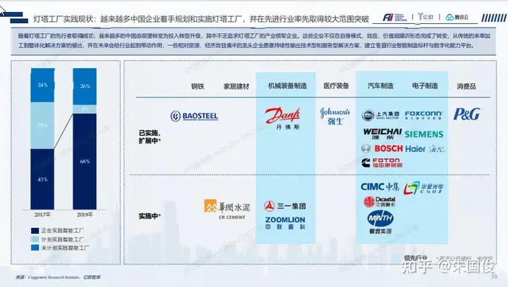 灯塔工厂实践现状:越来越多中国企业着手规划和实施灯塔工厂,并在先进行业率先取得较大范围突破。截止目前灯塔工厂已经在消费品行业、流程制造业、先进制造业(包含电子加工,家电,汽车,芯片,自动化)、医疗行业获得大量的推广和应用,并产生了显著的绩效改善效果。随着灯塔工厂的先行者取得成功,越来越多的中国由观望转变为投入转型升级,其中不乏追求灯塔工厂的产业领军企业。这些企业不仅在自身模式、效应、价值观意识形态完成了转变,从传统的来单加 工到整体化解决方案的输出,并在未来会给行业起到带动作用;一些相对资源、经济效益集中的龙头企业愿意持续性输出技术型和服务型解决方案,建立垂直行业智能制造标杆与数字化能力平台。