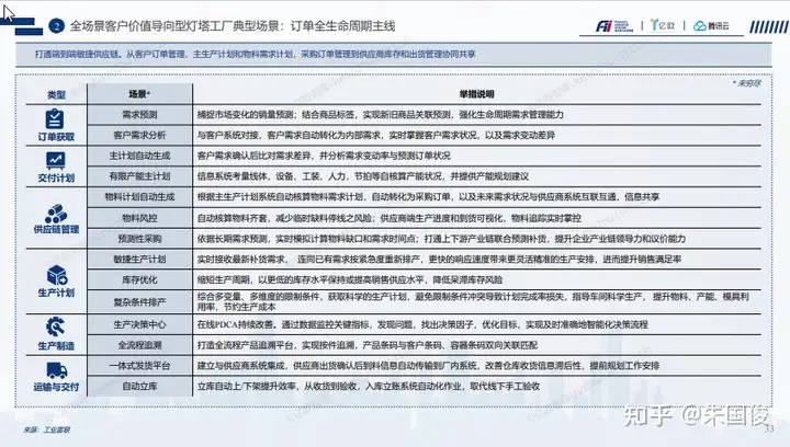 全场景客户价值导向型灯塔工厂典型场景:订单全生命周期主线 。包含定订单获取到交付计划,供应链管理,生产计划,生产制造,运输和交付等主要的6个场景。