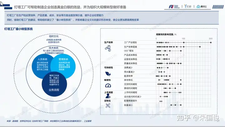 灯塔工厂可帮助制造企业创造真金白银的效益,并为组织大规模转型做好准备。灯塔工厂在提升增产里,增加韧性,提升发展可持续性三个维度全面发挥价值,提升企业经营能力同时,借助灯塔工厂的建设,帮助组织建立了“最小转型系统”(MTS),并影响着企业文化和意识形态转变,使企业更加愿意拥抱变革 。