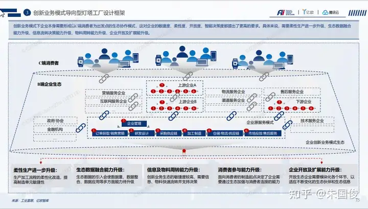 创新业务模式导向型灯塔工厂设计框架。创新业务模式下企业本身需要形成以C端消费者为出发点的生态协作模式,这对企业的敏捷度、柔性度、开放度、智能决策度都提出了更高的要求。具体来说,需要柔性生产进一步升级、生态数据融合 能力升级、信息流转决策能力升级、物料周转能力升级、消费者参与能力升级、企业开放及扩展能升级。