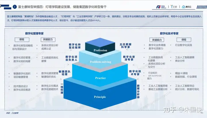 富士康转型举措四:灯塔学院建设发展、储备集团数字化转型骨干。富士康精密制造“黄埔军校”为中国制造业输送人才,“灯塔学院”与“工业互联网学院”产学研三位一体,提供理论、训练及专业场景的实践;组织上百家企业研学班,帮助中小企业培育专业及实践人 才。灯塔学院按照4P的人才发展体系培养数字化人才,培训至今,总计输送技能型人才达60148人。