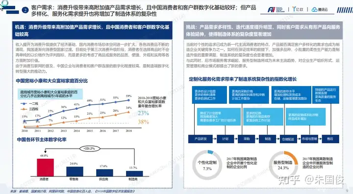 客户需求:消费升级带来高附加值产品需求增长,且中国消费者和客户群数字化基础较好;但产品 多样化、服务化需求提升也将增加了制造体系的复杂性。复杂度的增加体现在从产品研发到计划、采购、制造、仓储配送、市场营销和售后的各个环节。典型的如减少了采购批量,增加了生产换型的次数,增加了本成品和成品的种类,降低的无聊和配送的批量等等,对于运营效率和运营成本带来了非常大的挑战。