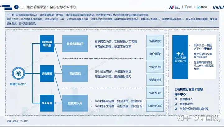 三一集团转型举措:全新智慧呼叫中心。三一重工以智能客服为切入点,辅助坐席提高工作效率,提升客服满意度和服务水平,并在与客户交互的过程中实现知识积累和信息共享。 腾讯云与三一合作打造全渠道客服,涵盖400电话、APP、小程序等多触点体系,构建全方位用户画像,解决现有客服体系痛点,包括接入渠道单一、客服技能水平不统一、平台与业务系统割裂、缺乏智 能化模块、客户满意度低等。