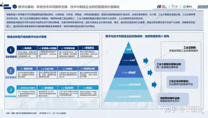 数字化基础(技术基础设施):新老技术共同提供支撑,技术与制造企业的匹配提供价值基础。智能制造5C架构基本可代表智能制造的基础架构,从感知层、分析层、网络层、决策层到配置层,逐层完成智能制造的价值实现,这背后是物联网、云计算、工业大数据及数据治理、工业互联网等 技术的支持;其工业云构建连接和计算基础,物联网构建工程边缘核心,工业大数据和数据治理技术提升认知效率,工业互联网形成多级协同。 智能制造关键技术中新与老技术虽然处在不同的成熟度,但基本都有落地的手段,因此与制造企业本身的流程、模式、痛点的匹配显得尤为重要。制造业转型要在基于宏观产业发展、战略需求的蓝 图上,通过现场的深度调研和价值梳理拆解真实明确需求,制定详细的规划后进行技术落地。 从实体到数字,从数字到数字,再从数字到实体。