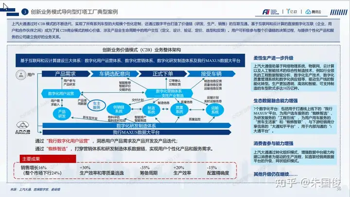 创新业务模式导向型灯塔工厂典型案例。上汽大通通过对 C2B 模式的不断迭代,实现了所有系列车型的大规模个性化定制,还通过数字平台打造了价值链(研发、生产、销售)的互联互通。基于互联网和云计算的直接数字化互联(企业、用 户和合作伙伴之间)成为了其 C2B商业模式的核心价值,涉及产品全生命周期中的用户交互(定义、设计、验证、定价、选型和反馈)。用户可积极参与整个价值链的决策过程,与提供个性化产品和服 务的公司建立良好的业务关系。