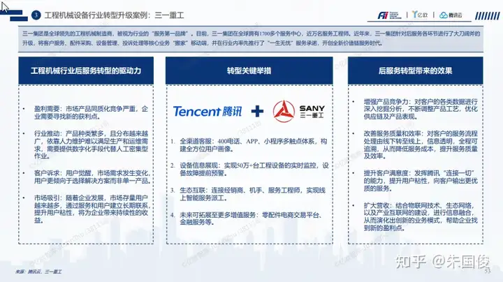 3 工程机械设备行业转型升级案例:三一重工。三一集团是全球领先的工程机械制造商,被视为行业的“服务第一品牌”。目前,三一集团在全球拥有1700多个服务中心,近万名服务工程师。近年来,三一集团针对后服务各环节进行了大刀阔斧的 升级,将客户服务、配件采购、设备管理、投诉处理等核心业务“搬家”移动端,并在行业内率先推行了“一生无忧”服务承诺,开创全新价值链服务时代。
