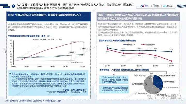 人才发展:工程师人才红利显著提升,提供潜在数字化转型核心人才优势;同时面临着中国基础工人劳动力红利减弱以及新型人才组织和培养挑战。根据麦肯锡的调查,人才和组织是工业4.0转型的主要障碍。