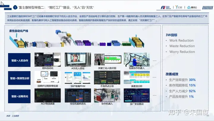 富士康转型举措二: “熄灯工厂”建设,“无人”且“无忧”。工业富联打造的深圳SMT工厂已经基本做到熄灯状态下的无人自主作业,全部生产活动由电子计算机进行控制,生产第一线配有机器人而无需特别配备工人。在专门生产智能手机等电气设备组件的工厂中 采用全自动化制造流程,配备机器学习和人工智能型设备自动优化系统、智能自我维护系统和智能生产实时状态监控系统,真正实现 “无忧熄灯工厂”。通过降低不增值的环节(Waste reduction), 减少增值部分的工作,提升生产力(Work reduction), 减少波动和变异(Worry reduction)来提升工厂的整体运行效率。