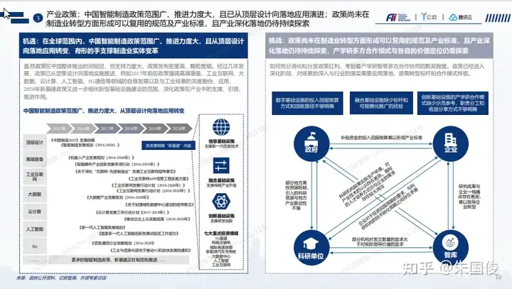 产业政策:中国智能制造政策范围广、推进力度大,且已从顶层设计向落地应用演进;政策尚未在 制造业转型方面形成可以复用的规范及产业标准,且产业深化落地仍待持续探索。