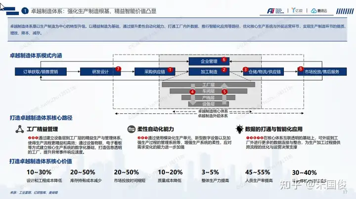 卓越制造体系:强化生产制造根基,精益智能价值凸显。卓越的制造体系包含卓越制造的核心体系即企业内部制造加工的能力,以及卓越制造的外延体系即端到端的价值链的能力。其核心路径是精益化-自动化-智能化。最终的目标是提升制造的效率:比如提升人人均产出,提升OEE, 降低库存,降低质量成本,提升生产力,缩短产品膳食的周期,降低设计和工程成本。