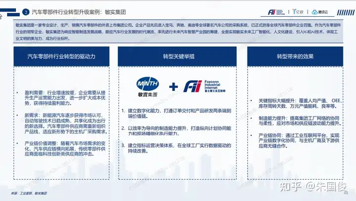 汽车零部件行业转型升级案例:敏实集团 。敏实集团是一家专业设计、生产、销售汽车零部件的外资上市集团公司。企业产品先后进入宝马、奔驰、奥迪等全球著名汽车公司的采购系统,已正式跻身全球汽车零部件企业百强。作为汽车零部件 行业的领军企业,敏实集团为响应智能制造发展战略,顺应汽车行业发展的时代潮流,率先进行未来汽车智慧产业园的筹建,全面实现敏实未来工厂智能化、人文化建设,引入5G和AI技术,体现工 业文明的美与力,成为行业标杆。