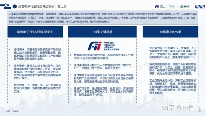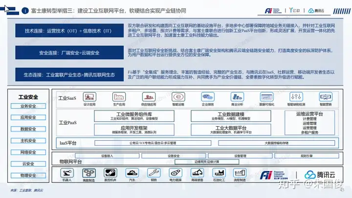 富士康转型举措三:建设工业互联网平台,软硬结合实现产业链协同 。双方联合研发和构建面向工业互联网的基础设施平台,多地多中心部署保障跨地域业务无缝接入,并针对工业互联网 多租户、多场景、按次计费等需求,与富士康联合进行创新工业PaaS平台创新,形成灵活扩展,开发运营一体化的先 进工业互联网平台,加速富士康工业科技能力输出。面对工业互联网安全新挑战,结合富士康厂端安全架构和腾讯云端全链路安全能力,打造高度安全的纵深防护体系, 为用户数据和平台运行提供全方位的安全保障。Fii基于“全集成”服务理念、丰富的智造经验、完整的产业生态,与腾讯云在IaaS、社群运营、移动端开发者生态以 及广泛的用户联结能力形成强力互补,共同携手为产业全价值链、全要素数字化转型升级进行赋能。