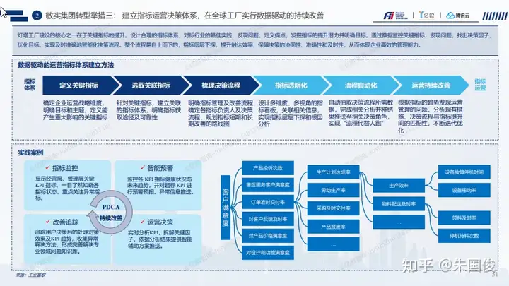 敏实集团转型举措三: 建立指标运营决策体系,在全球工厂实行数据驱动的持续改善。灯塔工厂建设的核心之一在于关键指标的提升。设计合理的指标体系,对标行业的最佳实践,发现问题,定义痛点,发掘指标的提升潜力并明确目标。通过数据监控关键指标,发现问题,找出决策因子, 优化目标,实现及时准确地智能化决策流程。整个流程是自上而下的,指标层层下探,提升触达效率,保障决策的协同性、准确性和及时性,从而体现企业高效的管理能力。