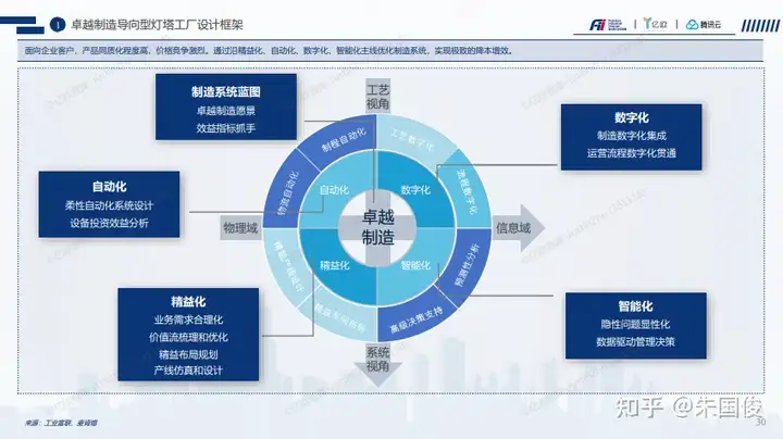 卓越制造导向型灯塔工厂设计框架 。从物理世界到虚拟世界,精益化,自动化,数字化,智能化是卓越制造的最重要的四个环节。