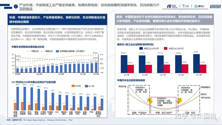 产业环境挑战- 主要体现在中国工业上市公司的毛利水平偏低(只有美国上市工业公司毛利水平的1/2),并且中国的工业企业的附加值比较低,目前还处于微笑曲线的底部。