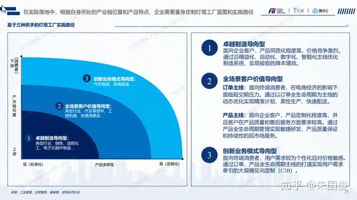 在实际落地中,根据自身所处的产业链位置和产品特点,企业需要量身定制灯塔工厂蓝图和实施路径。虽然从卓越的知道到全场景客户价值到创新业务模式是一个由内及外,复杂度低到高的过程。但是因为不同企业所处的行业不同和所处的价值链的位置不同,企业可以结合自身产业的特点选择合适的实施路径,不一定按照顺序推动。
