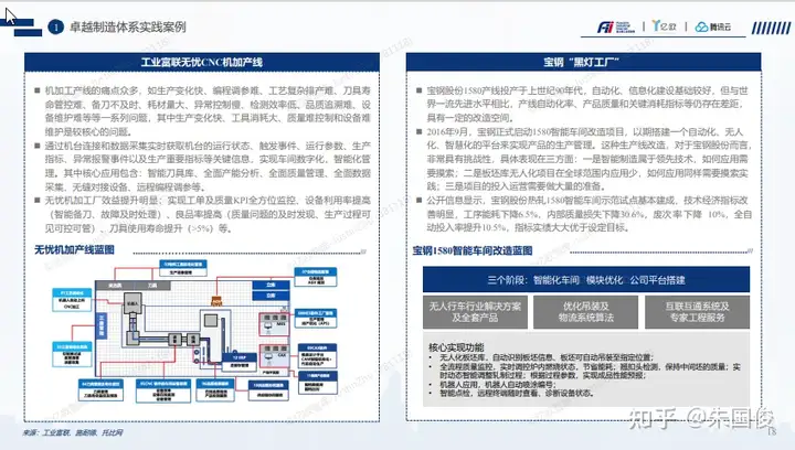 卓越制造体系实践案例-工业富联无忧CNC机加工生产线,宝钢黑灯工厂。工业富联无忧CNC机加工生产线通过机台连接和数据采集实时获取机台的运行状态、触发事件、运行参数、生产 指标、异常报警事件以及生产重要指标等关键信息,实现车间数字化,智能化管 理。其中核心应用包含:智能刀具库、全面产能分析、全面质量管理、全面数据 采集、无缝对接设备、远程编程调参等,实践后机加工厂效益提升明显:实现工单及质量KPI全方位监控、设备利用率提高 (智能备刀、故障及时处理)、良品率提高(质量问题的及时发现、生产过程可 见可控可管)、刀具使用寿命提升(>5%)等。2016年9月,宝钢正式启动1580智能车间改造项目,以期搭建一个自动化、无人 化、智慧化的平台来实现产品的生产管理。这种生产线改造,对于宝钢股份而言, 非常具有挑战性,具体表现在三方面:一是智能制造属于领先技术,如何应用需 要摸索;二是板坯库无人化项目在全球范围内应用少,如何应用同样需要摸索实 践;三是项目的投入运营需要做大量的准备。实施后,公开信息显示,宝钢股份热轧1580智能车间示范试点基本建成,技术经济指标改 善明显,工序能耗下降6.5%,内部质量损失下降30.6%,废次率下降 10%,全自 动投入率提升10.5%,指标实绩大大优于设定目标。
