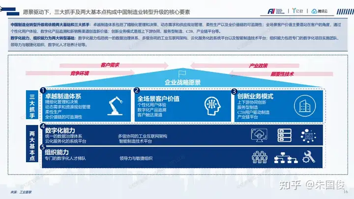 愿景驱动下,三大抓手及两大基本点构成中国制造业转型升级的核心要素 。三大抓手:卓越的制造体系,全场景的客户价值以及创新的业务模式。两大抓手:数字化和组织能力。