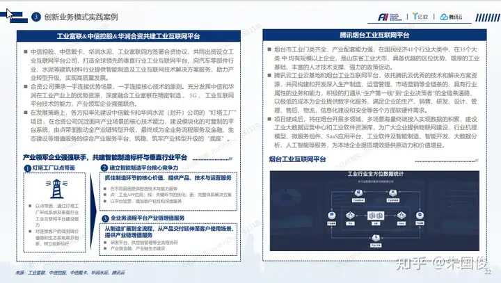 创新业务模式实践案例-垂直行业工业互联网平台。中信控股、中信戴卡、华润水泥、工业富联四方签署合资协议,共同出资设立工 业互联网平台公司,打造全球领先的垂直行业工业互联网平台,向汽车零部件行 业、水泥等建筑材料行业提供智能制造及工业互联网技术解决方案服务,助力产 业转型升级,实现高质量发展。在发展策略上,各方拟率先建设中信戴卡和华润水泥(封开)公司的“灯塔工厂” 项目,在合资公司沉淀面向产业场景的核心技术能力,建设模块化的可复制的平 台系统,由点带面推动全产业链转型升级,最终成为全业务流程服务及金融、生 态建设等增值服务的综合产业服务平台,筑稳、筑牢产业转型升级的“底座”。腾讯云工业云基地和烟台工业互联网平台,依托腾讯云优秀的技术和解决方案资 源,共同构建和开发深入生产制造、运营管理、市场营销等全链条的、具有行业 属性的业务和能力,积极的打通从“生产第一线”到“企业决策者”的全链条通路, 以极低的成本为企业提供数字化服务,满足企业的生产、销售、研发、设计、管 理、售后、物流、信息化建设和安全等各个方面软硬件需求。项目建成后,将在烟台开展多领域、多场景海量终端接入实现数据的积累,建设 工业大数据运营中心和工业软件资源库,为广大企业提供物联网建设、行业机理 模型、微服务组件、SaaS应用平台、工业软件及智能制造、智能开发、大数据分 析、人工智能等服务,为本地企业提质增效提供原动力和价值增益。