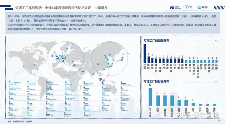 灯塔工厂实践现状:全球44家获得世界经济论坛认证,中国最多。这份报告的时间比较早,实际上截止到2023年1月全球已经有132家灯塔工厂进入灯塔网络,其中位于中国的灯塔工厂共计48家,占了36%。