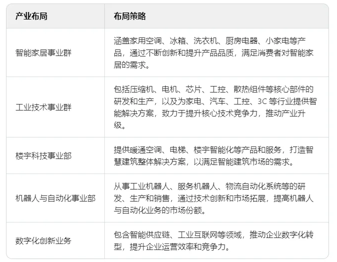 美的集团:美的集团坚持“全面数字化、全面智能化”战略,通过技术创新和产品升级不断提升市场竞争力。同时,美的集团还积极布局智能家居、新能源等新兴领域,以拓展新的增长点。美的集团董事长方洪波表示:“美的将继续深化数字化转型和创新驱动发展战略,为股东创造更大价值。”