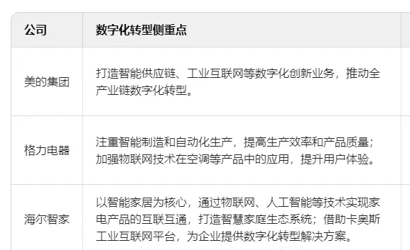 格力电器:格力电器也在积极推进数字化转型,通过建设智能工厂和数字化管理平台提升了生产效率和产品质量。然而相比美的集团,格力在数字化转型的步伐上稍显滞后需要加大投入以缩小差距。