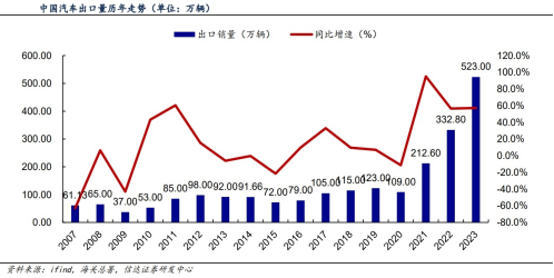当前,中国汽车出海长期趋势明确,汽车出口规模快速增长,发展质量优中有升。自2021年以来,中国汽车出口市场呈现超强增长。据海关总署的出口数据,23年我国汽车出口522.1万台(22年同期331.7万台),出口增速57.4%,目前已经是世界第一大汽车出口国,未来潜力更是巨大。