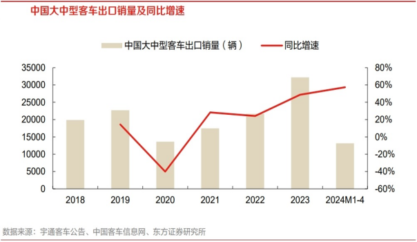 客车景气度受出行总量、出行结构、国家及地方政策等影响较大,2024年在公共客运及旅游出行恢复和以旧换新、公共领域车辆全面电动化试点等政策推动下国内客车市场恢复态势较好,但宏观经济恢复面临挑战、地方财政压力等仍然使得国内市场需求存在较大不确定性;另一方面,国内客车产品同质化程度较高,价格竞争较为激烈,也使得国内市场盈利压力较大。与国内市场相比,疫情影响结束后海外出行及旅游需求持续回暖,海外客车需求逐步恢复,叠加大选年将有望进一步促进公共交通市场需求提升;此外,全球减碳大背景下, 各国不断出台的节能减排和绿色基金计划有望促进海外新能源客车需求持续增长,“一带一路” 倡议亦为中国客车企业出海提供良好机遇,中国客车企业有望乘“一带一路”东风积极参与共建海外客车制造和服务体系,为突破海外市场奠定基础。