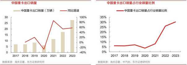 2017-2019年重卡出口销量整体稳步提升,2020年疫情影响下重卡出口销量下降至6.1万辆,2021年起全球重卡需求快速恢复,重卡出口销量大幅提升至11.4万辆,同比增长86.9%;2022年重卡出口销量17.5万辆,同比增长53.5%。2023年国内重卡企业不断提升产品和品牌竞争力,积极出海抢占俄罗斯等增量市场份额,出口销量进一步提升至27.6万辆,同比增长57.7%。重卡出口销量占行业销量比例持续提升。从销量占比看,2017年重卡出口销量占行业销量比例仅为6.2%,2021年起随着中国出口销量快速增长,出口销量占行业销量比例快速提升,2022年出口销量占比已增至26.0%,2023年进一步提升至30.3%,海外市场已成为中国重卡行业的核心增长点之一。数字化转型网www.szhzxw.cn
