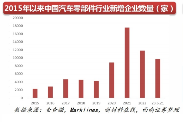 依据企查猫数据显示,2020年中国汽车零部件行业新增注册存续企业8848家,同比增长107.9%;2021年新增17558家,同比增长98.4%,连续2年保持高速增长。