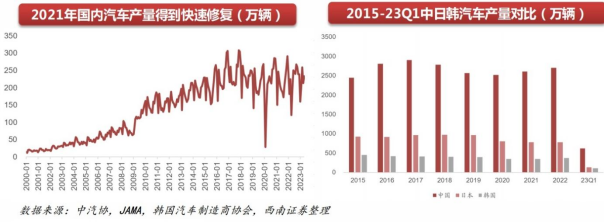 2021年中国汽车产量得到快速修复,同比实现转正,全年生产2608.2万辆,同比增长3.4%,同年日/韩汽车产量持续下滑2.7%/1.3%。