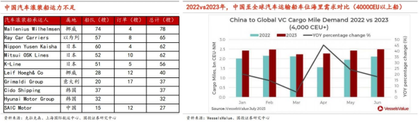 4、出海≠出口,物流、金融、售后需配套“走出去”运输方面:滚装船为跨洋整车运输最主流和常规的方式,而中国汽车滚装船运力与出口量不匹配,根据克拉克森数据显示,截至2024年1月底中国汽车滚装船只有39艘、共11.5万车位、占全球运力不足3%。2019年至2023年11月底,一艘6500标准车位滚装船费用已从每天2万美元突破12万美元,日韩等在汽车出口有先发优势且规模庞大的传统车企已与船东签订长期协议、锁定运价涨幅,因此受到的影响并不大,而中国整车出海仍处于起步阶段,只能被动承受运价的上涨。金融方面:海外本土车企或出海较早的日系车企基本都有自持银行或自己的金融服务公司:可以提供更优惠的低首付、低息方案;二手车残值管理更具优势;银行本身资信要求较高、风险控制严格。而中国车企一是获取金融牌照难度大,二是国家对金融机构对外投资有严格限制,因此在提供金融方案时存在劣势。售后方面:日系车进入海外市场较早,生产层面,供应链在当地采买比例较高、销售服务网点多,维修较快;而中国车企及其供应链体系仍处于出海初期,售后网点搭建不完善,导致售后时间长、成本高。