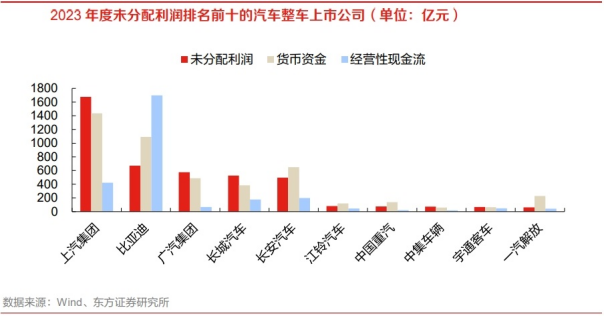 在企业实际的分红决策过程中,未分配利润的规模和质量是一个重要考虑因素。此外,企业还会综合考虑其财务状况、未来发展战略、股东利益以及市场环境等因素来确定分红比例。一般而言,如果企业的未分配利润较多,则表明企业有较强的积累能力和资金储备,可能会倾向于进行现金分红或增加分红比例。反之,如果未分配利润较少或为负数,企业可能会减少分红或不分红,以保留更多的资金用于企业的运营和发展。需要注意的是,企业未分配利润中包含应收账款、应收票据等非现金资产,因此要综合考虑企业的现金流水平和资产负债情况来判断公司持续分红能力。截至2023年,整车上市公司未分配利润排名前十分别是:上汽集团、比亚迪、广汽集团、长城汽车、长安汽车、江铃汽车、中国重汽、中集车辆、宇通客车、一汽解放。整车板块上市公司呈现出明显差异,上汽集团2023年度未分配利润排名第一,高达1674.71亿元,货币资金1436.36亿元;比亚迪、广汽集团、长城汽车、长安汽车未分配利润较高且总体接近,分别为671.24、576.27、527.29、496.18亿元,其中比亚迪经营性现金流为1697.25亿元,显著优于其他整车企业,体现了良好的经营能力。总体来看,整车上市公司的经营性现金流情况优于零部件公司,同时呈现出较强的马太效应。