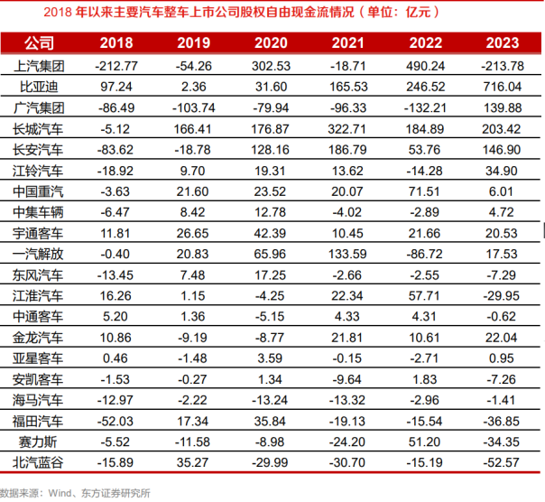 整车上市公司的货币资金情况以及经营性现金流表现相对较好,然而随着新能源汽车行业的快速发展,整车上市公司尤其是传统乘用车企面临着严峻的转型压力,需要结合股权自由现金流情况综合分析。