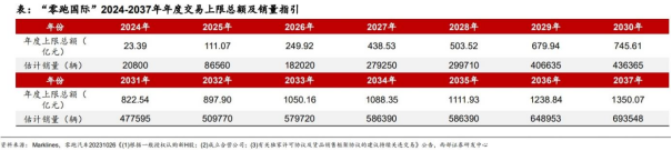 “零跑国际”(Leapmotor International)是由Stellantis集团和零跑汽车以51%:49%的比例成立的合资公司,专注于出口业务,通过借助Stellantis集团在全球范围内的广泛商业资产、实力和积淀,该合资企业将加速并扩张零跑汽车高技术含量和极具品价比的产品在全球的销售。根据零跑汽车公告,合资公司“零跑国际”在2024/2025/2026年的年度交易总额上限分别为23.39/111.07/249.92亿元。在2024/2025/2026年的销量指引分别为2.08/8.66/18.20万辆,预计在2037年达到69.35万辆。