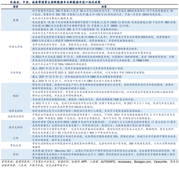 1、东南亚、中亚、南美等市场或将会成为中国汽车出口的新增长点出海国家往后几年增长展望:欧洲目前是新能源车最主要的海外市场,主要由于当地居民消费能力强且市场推广政策较好。但欧美车企在电动化/智能化技术上落后自主车企,为保护本土市场,纷纷以实现电车产业链本土化为缘由,推出贸易保护性措施,随着美国和欧盟出台相关限制性法规导致贸易壁垒升高,东南亚、中亚、南美等市场或将会成为中国汽车出口的新增长点。