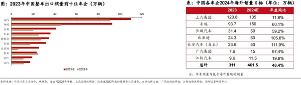 从各车企销量目标来看,预期2024年长安、比亚迪、广汽的海外销量将继续保持90%以上的高增速,主要为基数较低且海外还有空白市场;上汽、江铃等增速放缓,预期同比增长12%/20%。