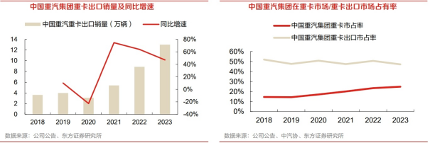 以中国重卡出口龙头企业——中国重汽为例,截至2023年末,中国重汽集团在全球110多个国家和地区发展营销网络200余家,并在110多个国家和地区建立了近500个服务网点和配件网点, 建立了26 个境外合作KD生产工厂。中国重汽集团已经基本覆盖了非洲、中东、中南美、中亚和东南亚等发展中国家和主要新兴经济体,并在澳大利亚、爱尔兰、新西兰等国家和香港、台湾等部分成熟市场建立了国际营销网络体系。据公司公告,中国重汽在出口领域一方面在传统市场持续导入具有竞争力的新产品,持续完善产品矩阵;另一方面,2023年出口产品中高端产品占比超过40%;品牌端,公司在中亚、中东、非洲、东南亚等地举办了多场全球合作伙伴大会,促进品牌影响力和企业形象提升;营销端,公司继续深化营销改革,布置下沉网络和强化服务营销,实现头部市场份额继续扩大。